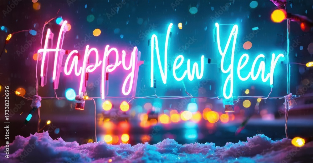 WEBLUX obraz na plátně 1D, 3D, 4D, 5D - Bright neon sign displays Happy New Year. Festive lights blur background, creating celebratory mood. Snow covers bottom portion.