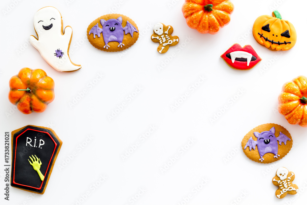 WEBLUX obraz na plátně 1D, 3D, 4D, 5D - Layout of Halloween gingerbread biscuits with pumpkins, top view