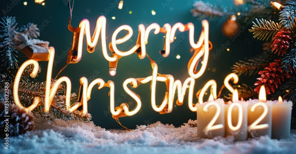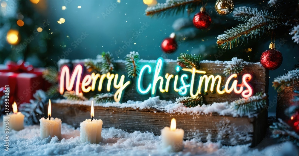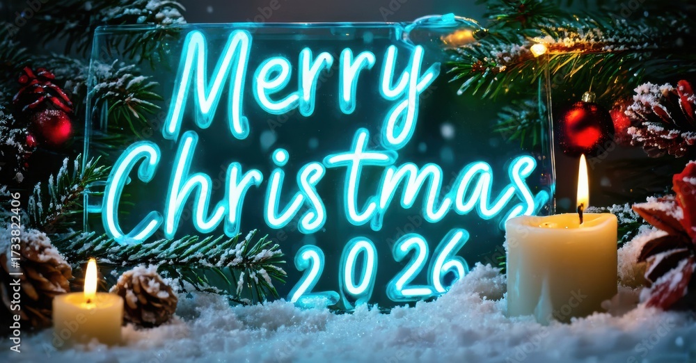 WEBLUX obraz na plátně 1D, 3D, 4D, 5D - Festive scene. Bright neon sign displays Merry Christmas 2026. Candles illuminate snowy foreground, surrounded by evergreen branches. Holiday spirit.