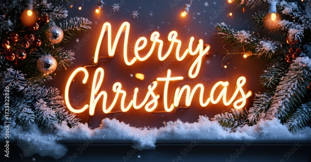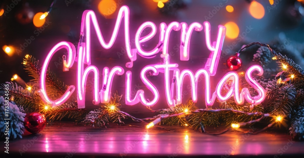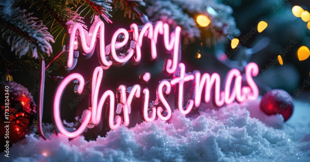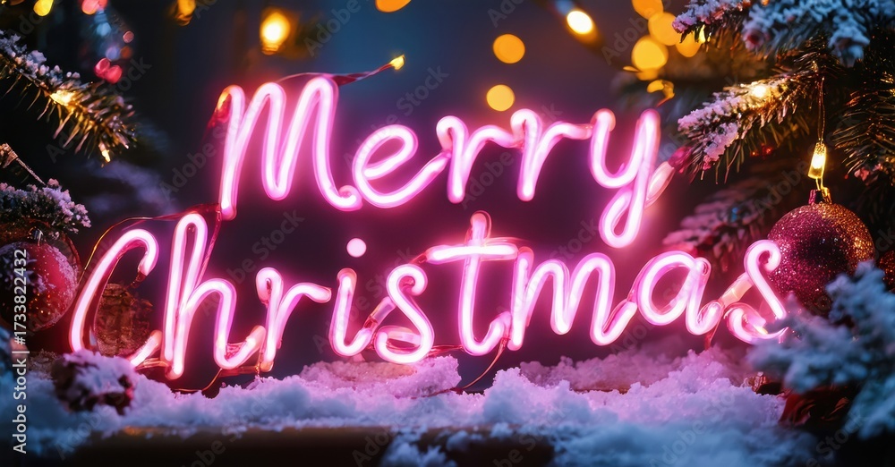 WEBLUX obraz na plátně 1D, 3D, 4D, 5D - Bright pink neon sign displays Merry Christmas. Snowy background features festive lights, ornaments, evergreen branches. Holiday season greeting.