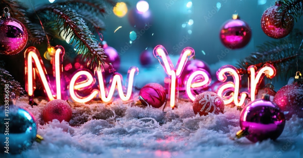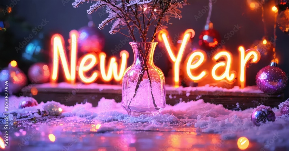 WEBLUX obraz na plátně 1D, 3D, 4D, 5D - Festive scene shows bright New Year neon sign surrounded by ornaments, snow, fir branches. Colorful lights create joyful holiday atmosphere.