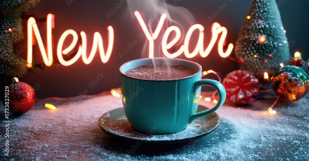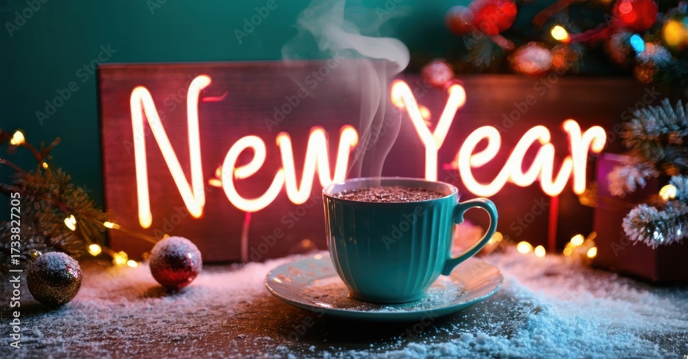 WEBLUX obraz na plátně 1D, 3D, 4D, 5D - Festive scene features steaming beverage, bright neon sign reading New Year, winter decor. Cozy, warm atmosphere perfect holiday season.