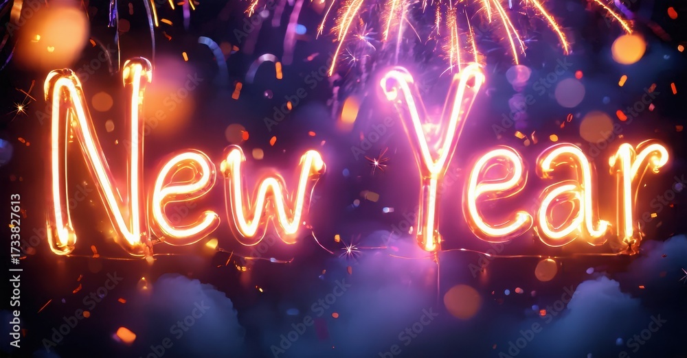 WEBLUX obraz na plátně 1D, 3D, 4D, 5D - Bright neon New Year text glows amid fireworks, smoke, bokeh effects. Festive celebration imagery dominates scene.