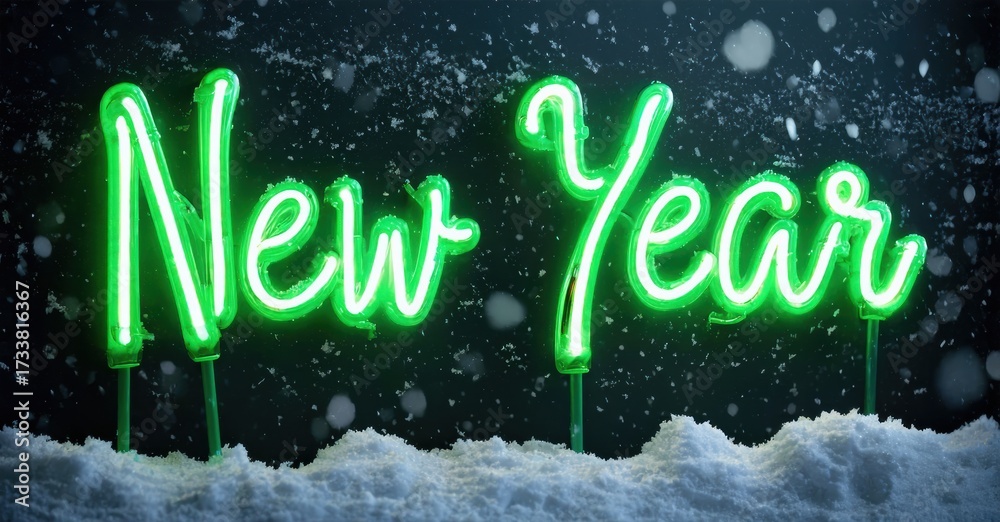 WEBLUX obraz na plátně 1D, 3D, 4D, 5D - Bright neon New Year sign glows above snow. Dark background features falling snowflakes, creating festive winter scene.