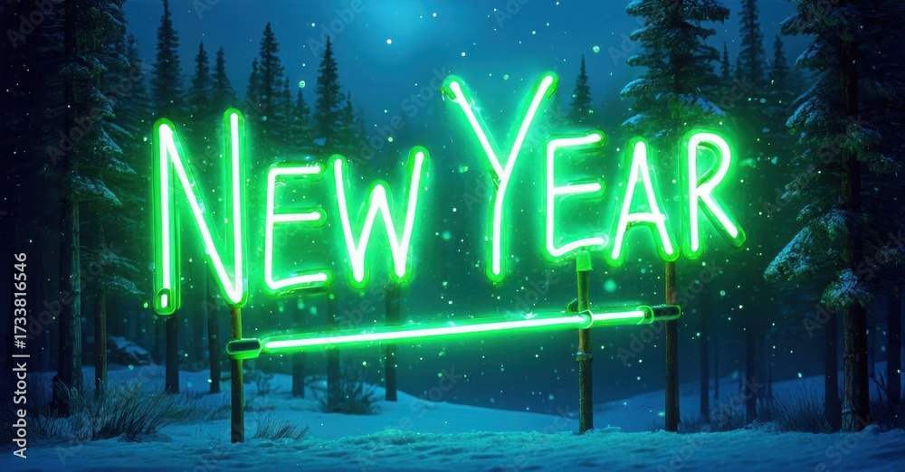 WEBLUX obraz na plátně 1D, 3D, 4D, 5D - Bright neon sign displays New Year amidst snowy forest. Dark blue sky, winter scene, festive illumination.