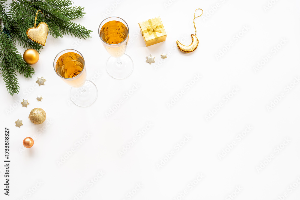 WEBLUX obraz na plátně 1D, 3D, 4D, 5D - Christmas decoration top view - fir tree branch and two glasses of champagne. Festive flat table setting