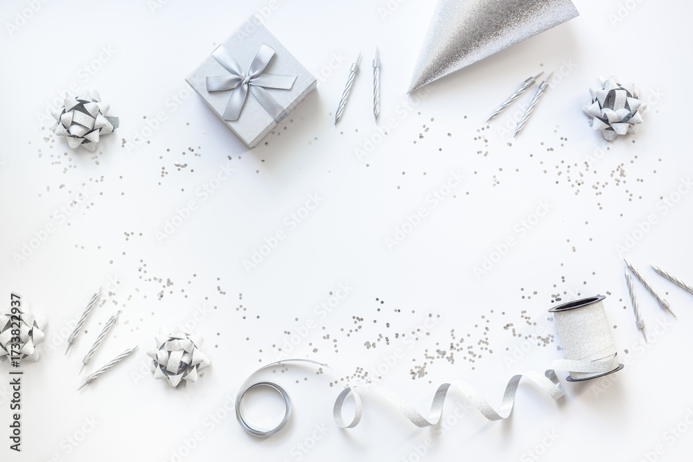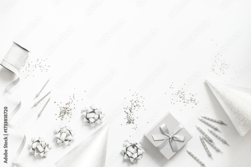 WEBLUX obraz na plátně 1D, 3D, 4D, 5D - Holiday festive party flat lay with silver carnaval caps and cake candles, top view. Gift box and streamers on white background