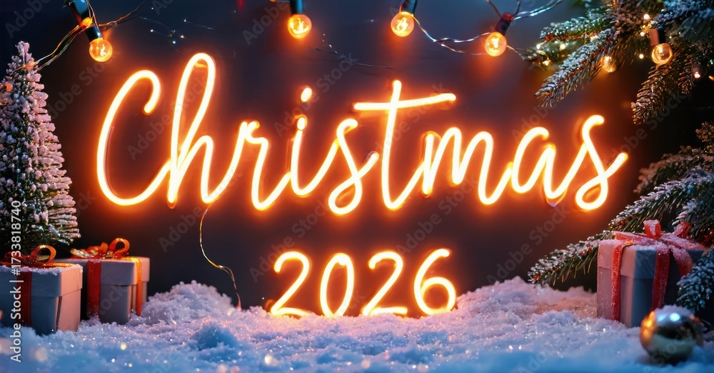 WEBLUX obraz na plátně 1D, 3D, 4D, 5D - Bright neon Christmas sign illuminates snowy scene. Presents below, lights above. Festive holiday greeting for year 2026.