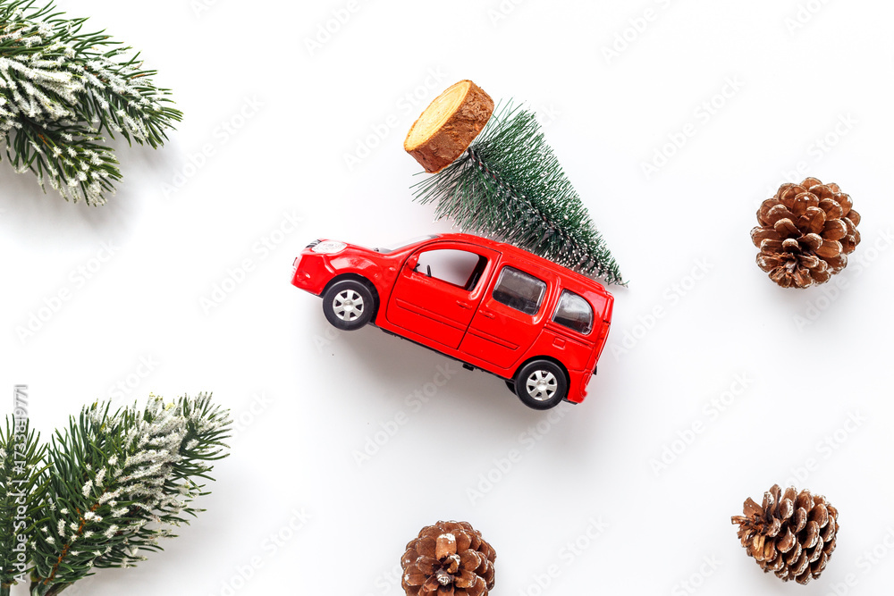 WEBLUX obraz na plátně 1D, 3D, 4D, 5D - New Year layout. Red toy car carrying Christmas tree. Festive New Year decoration and Christmas background