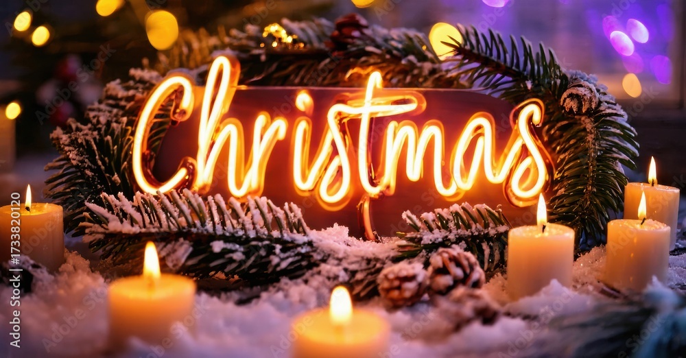 WEBLUX obraz na plátně 1D, 3D, 4D, 5D - Festive scene features glowing Christmas neon sign surrounded by evergreen branches, pinecones, lit candles. Warm lighting creates cozy atmosphere.