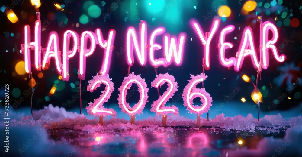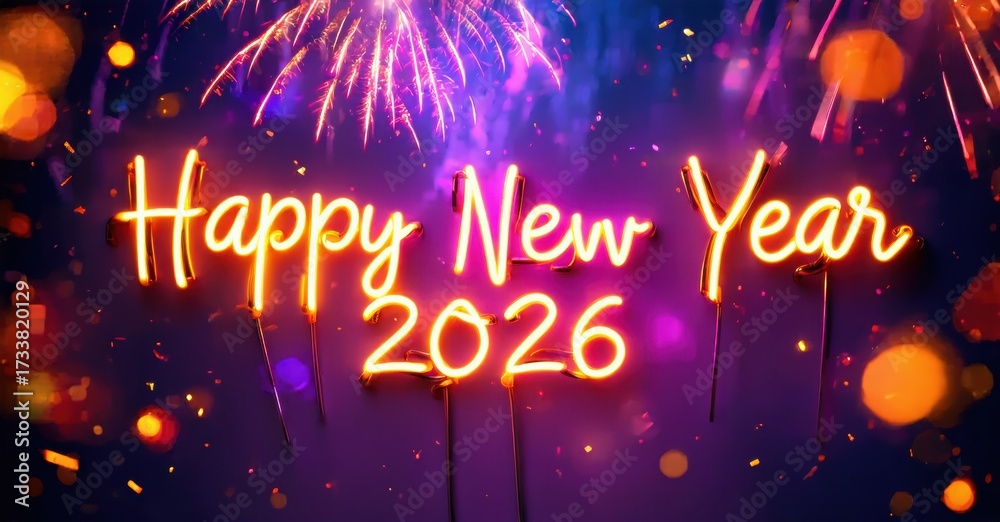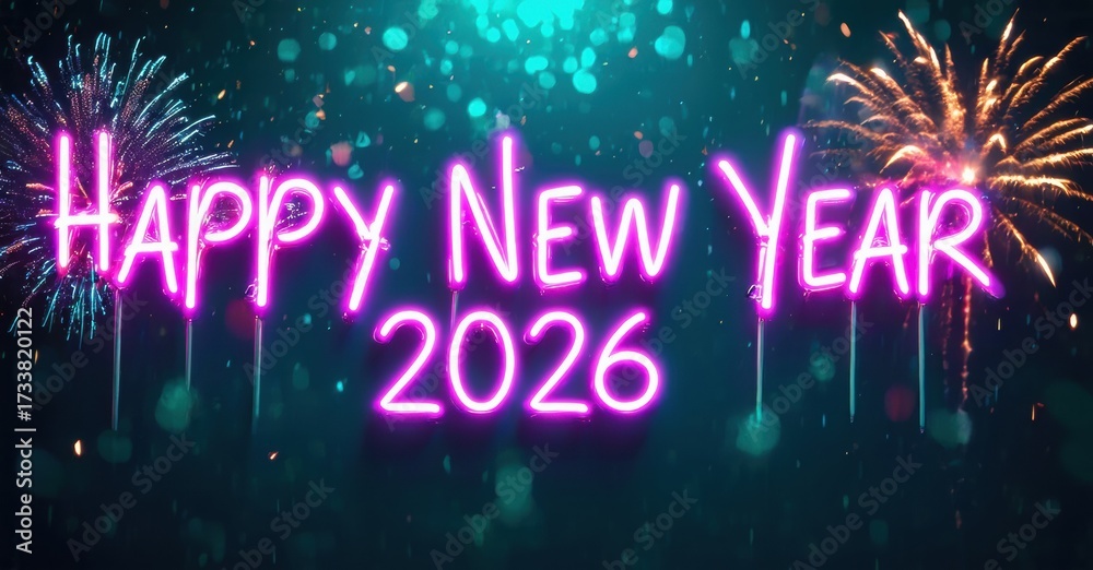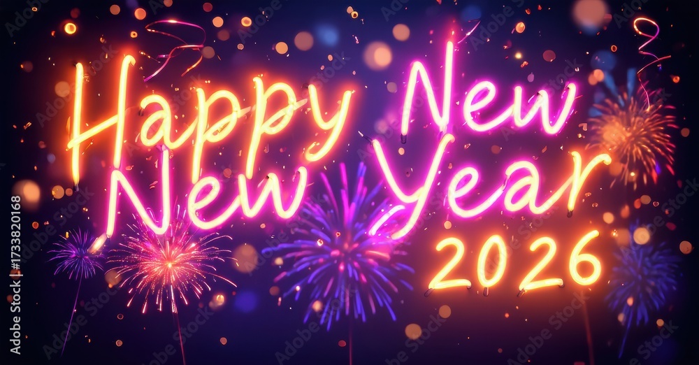WEBLUX obraz na plátně 1D, 3D, 4D, 5D - Bright neon sign displays Happy New Year 2026 against blurred fireworks, festive bokeh lights. Celebratory, vibrant scene.