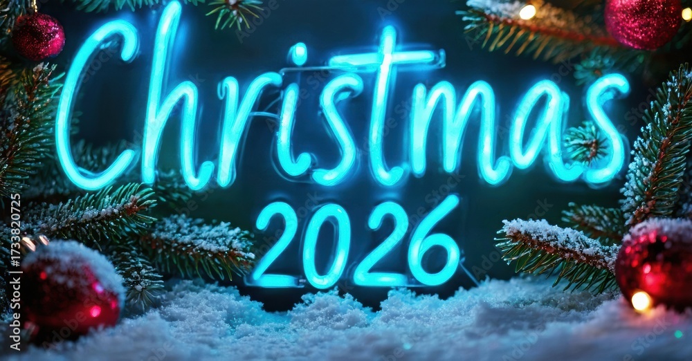 WEBLUX obraz na plátně 1D, 3D, 4D, 5D - Bright neon Christmas sign with year 2026. Festive evergreen branches, red ornaments, snow create holiday mood. Dark background enhances glow.