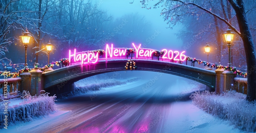 WEBLUX obraz na plátně 1D, 3D, 4D, 5D - Snowy bridge illuminated, festive lights display Happy New Year 2026. Winter scene evokes holiday spirit, peaceful ambiance.