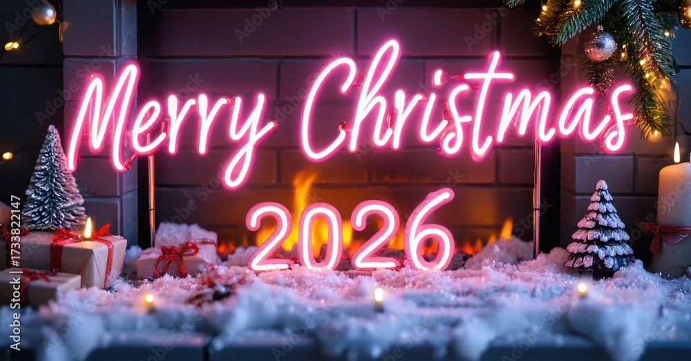 WEBLUX obraz na plátně 1D, 3D, 4D, 5D - Festive scene. Bright neon sign displays Merry Christmas 2026 above fireplace. Presents, trees, lights create cozy holiday atmosphere.