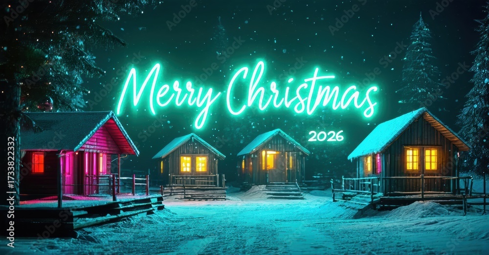 WEBLUX obraz na plátně 1D, 3D, 4D, 5D - Winter scene depicts cozy cabins illuminated, festive neon message Merry Christmas 2026. Snow covers landscape, creating peaceful ambiance.