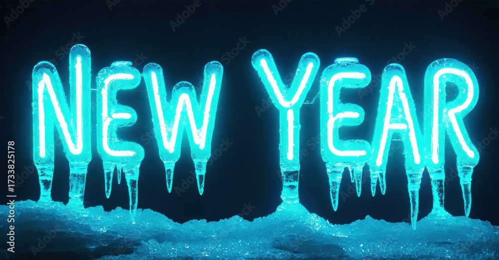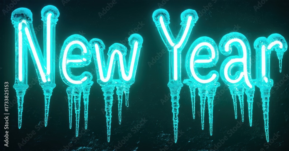 WEBLUX obraz na plátně 1D, 3D, 4D, 5D - Bright neon text spells New Year. Icicles drip from glowing turquoise letters against dark background. Festive winter design.