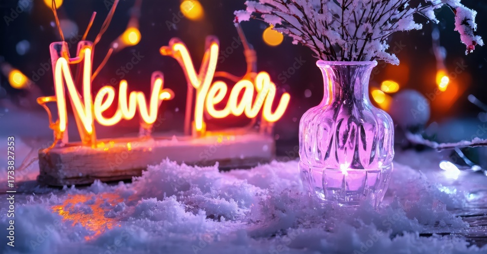 WEBLUX obraz na plátně 1D, 3D, 4D, 5D - Festive scene. Neon New Year sign, snow covered surface, vase with branches. Warm lights create cozy winter atmosphere.