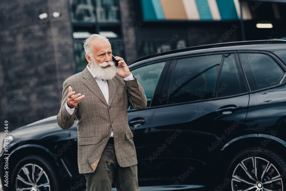 WEBLUX obraz na plátně 1D, 3D, 4D, 5D - Elderly bearded businessman standing by stylish car outdoors, talking on mobile phone in urban setting