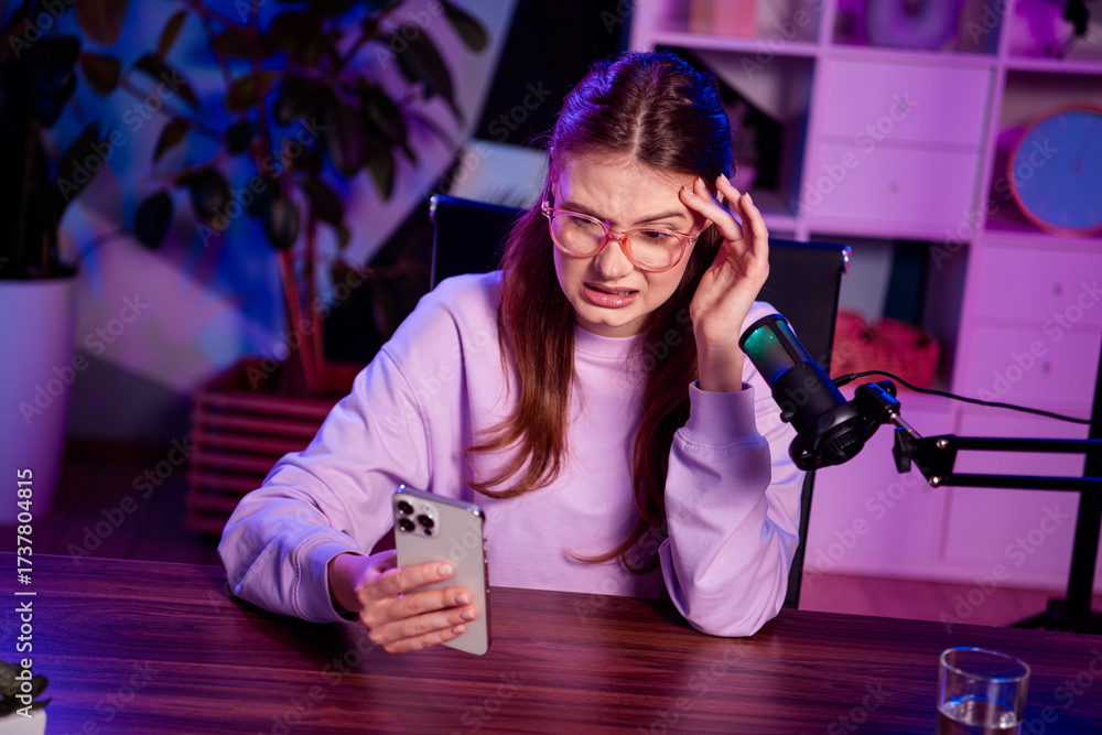 WEBLUX obraz na plátně 1D, 3D, 4D, 5D - Young female blogger with microphone and smartphone streaming live in a neon-lit interior setting, expressing emotions