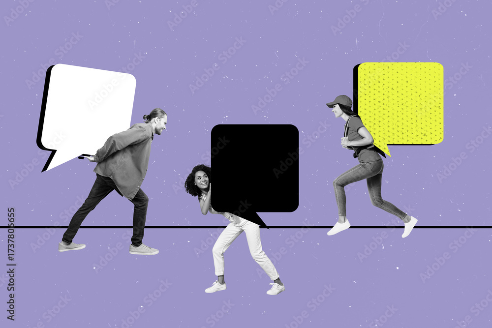 WEBLUX obraz na plátně 1D, 3D, 4D, 5D - Creative poster banner 3d collage photo of three happy girls man carry bubble communication chatterbox notification discussion