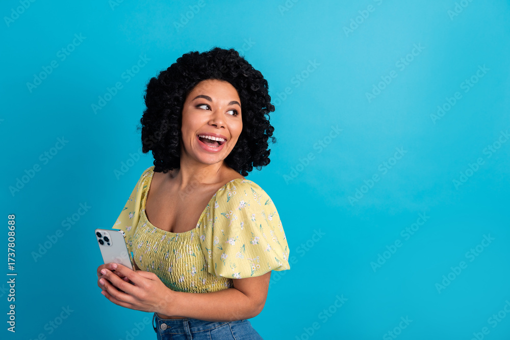 WEBLUX obraz na plátně 1D, 3D, 4D, 5D - Charming cheerful woman with curly hair holding a smartphone on a blue background, showcasing modern and casual style