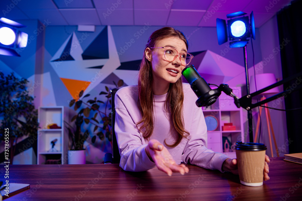 WEBLUX obraz na plátně 1D, 3D, 4D, 5D - Young woman in casual style streaming online podcast from home with microphone setup and neon lighting