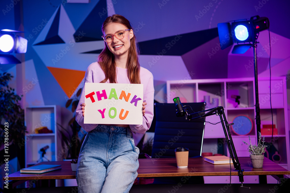 WEBLUX obraz na plátně 1D, 3D, 4D, 5D - Young female blogger holding thank you sign in colorful studio with microphone for media and broadcasting content creation