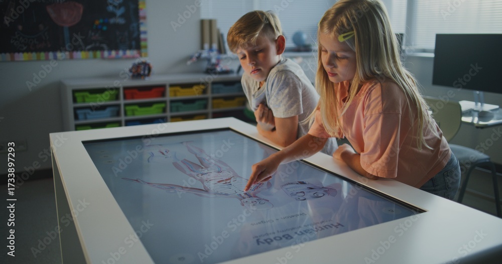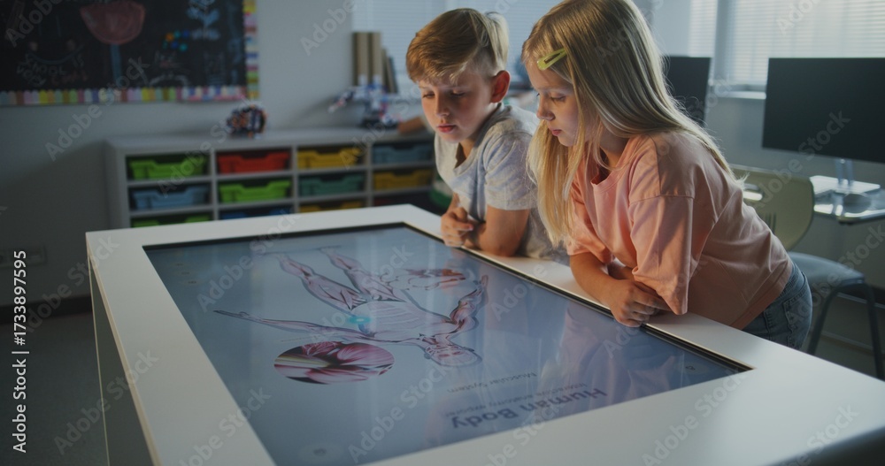 WEBLUX obraz na plátně 1D, 3D, 4D, 5D - Schoolchildren Collaborate at Touchscreen, Examining Human Anatomy. Kids Talk, Actively Engage in Science Study. Concept of Modern Classroom Technology, Cooperative Biology Learning. Dolly Shot.