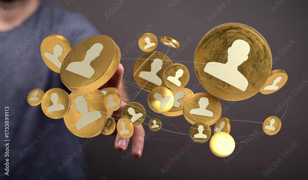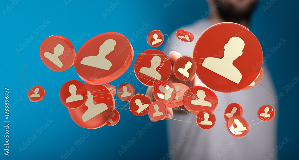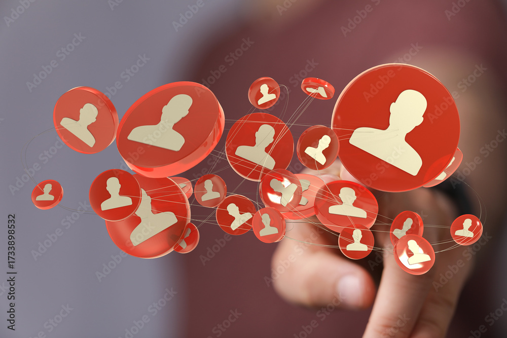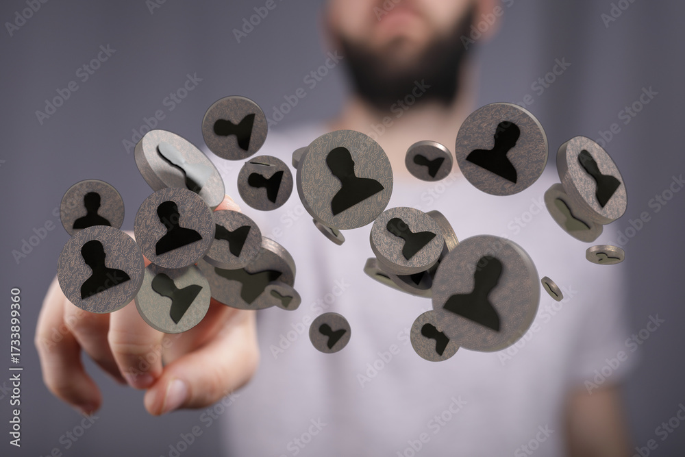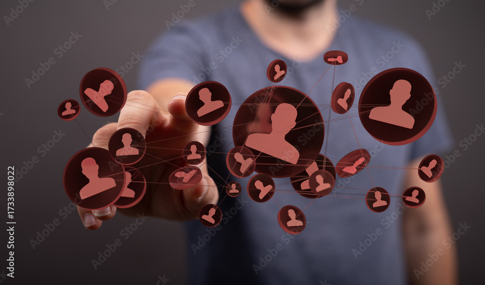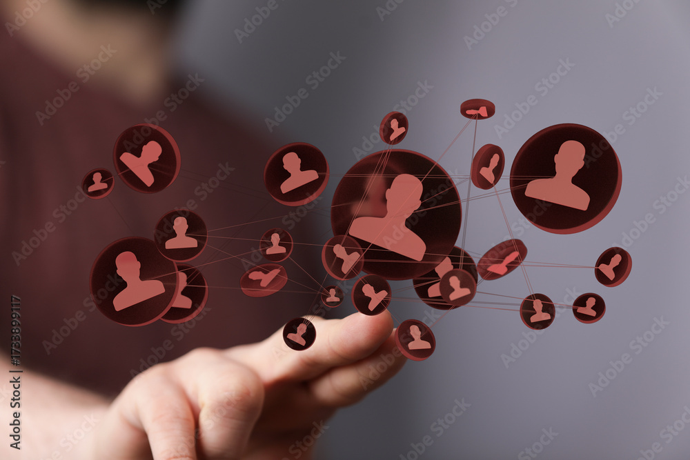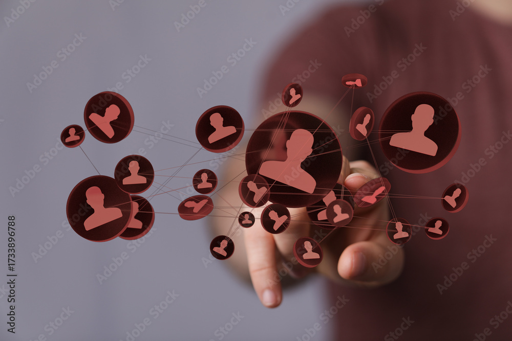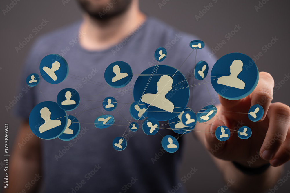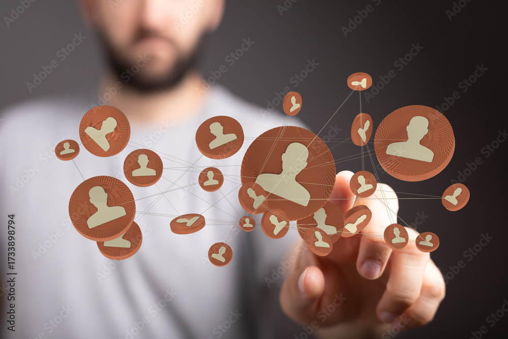 WEBLUX obraz na plátně 1D, 3D, 4D, 5D - Man touches interconnected profile icons, representing social network or business communication. Illustrates connection and collaboration.