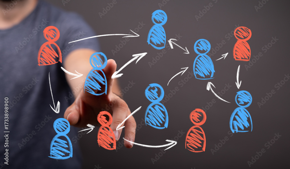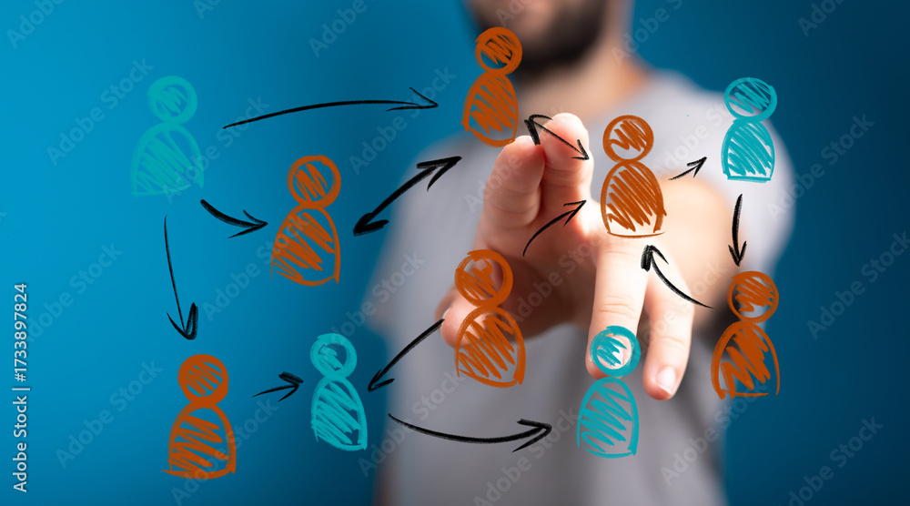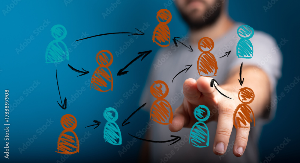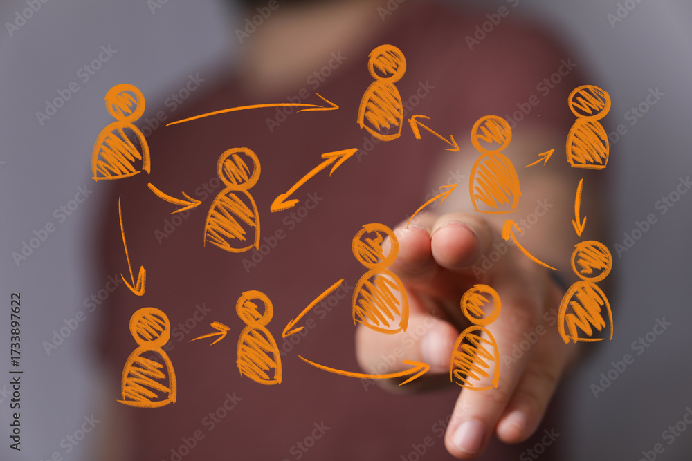 WEBLUX obraz na plátně 1D, 3D, 4D, 5D - Hand pointing at network diagram. Concept of connection, collaboration, teamwork, and business networking.