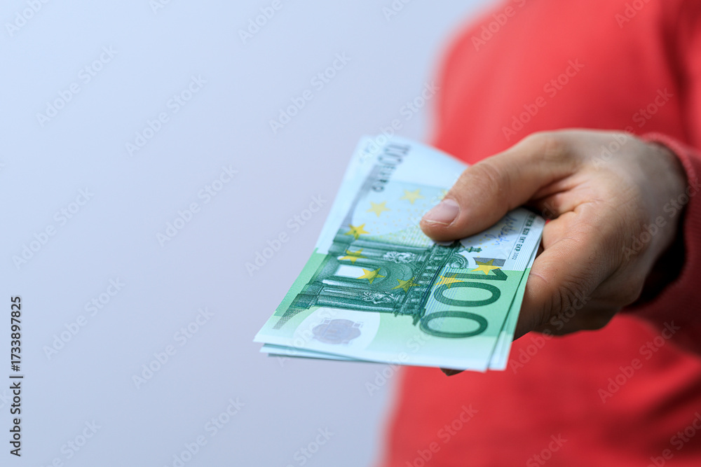 WEBLUX obraz na plátně 1D, 3D, 4D, 5D - Close-up shot of a hand holding several 100 euro banknotes, suggesting wealth, finance, or payment. Ideal for financial and business concepts.