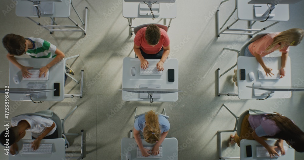 WEBLUX obraz na plátně 1D, 3D, 4D, 5D - Children Typing on Keyboards in Computer Lab. Kids Studying at Computers in Bright Computer Lab, Learning Technology and Developing Computer Skills. Concept of Modern Education. Top View. Static Shot.