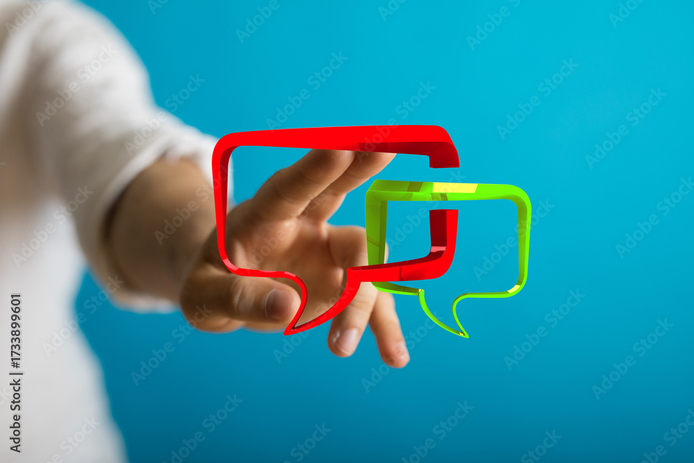 WEBLUX obraz na plátně 1D, 3D, 4D, 5D - Conceptual communication. Close up on hand pointing at red and green communication bubbles. Sign of sharing, discussion, and dialogue.
