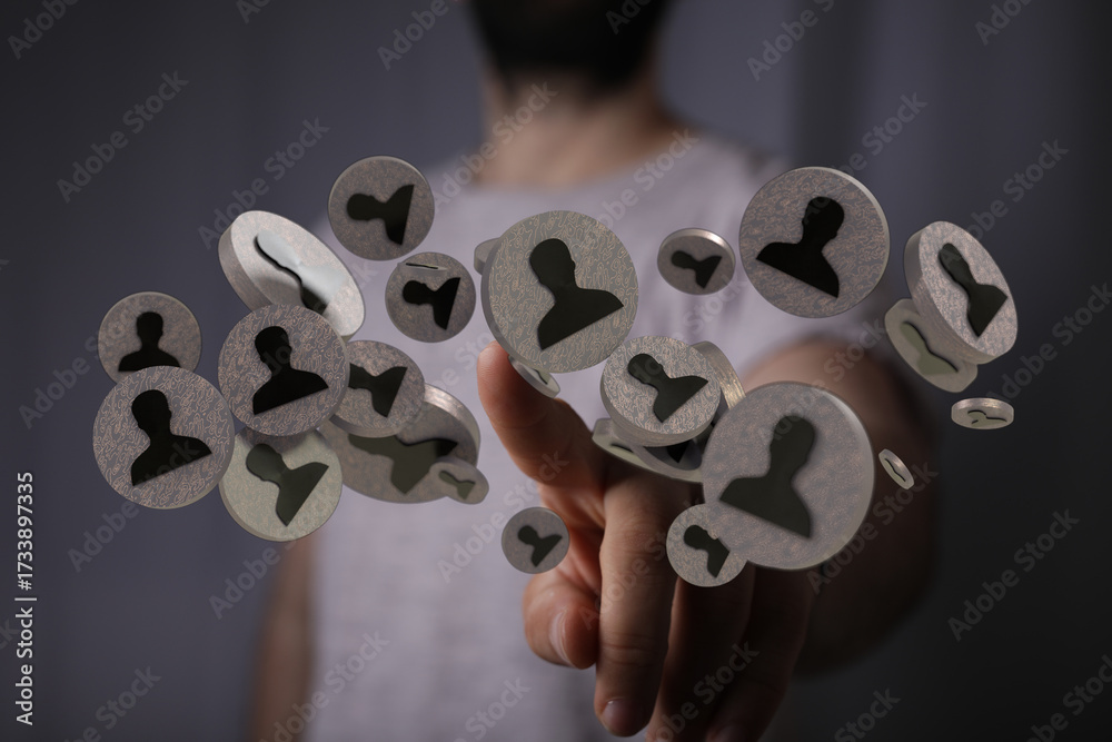 WEBLUX obraz na plátně 1D, 3D, 4D, 5D - A man`s finger touches social network avatar icons. Concept of connections, teamwork, communication and digital interface.