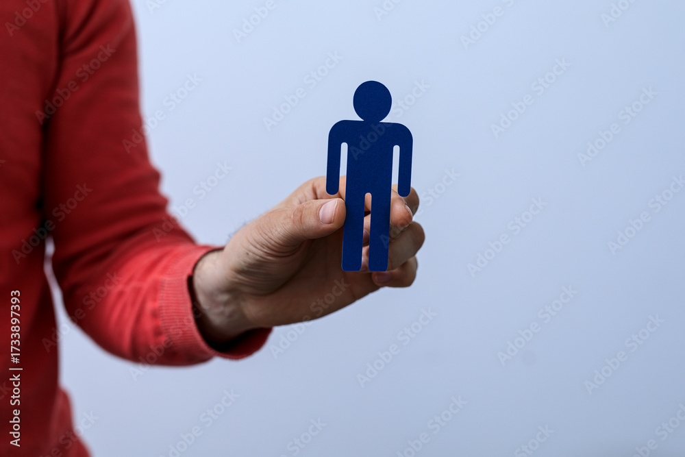 WEBLUX obraz na plátně 1D, 3D, 4D, 5D - Close-up of a hand holding a blue human figure. The image evokes concepts of people, leadership, and community. Suitable for business and social