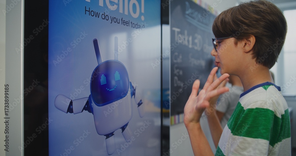 WEBLUX obraz na plátně 1D, 3D, 4D, 5D - Close Up of Schoolchild in Good Mood Interacting With AI Based Mood Tracking Tool in Modern Classroom. Concept of Integrating Educational Technologies and Supporting Mental Health. Static Shot.