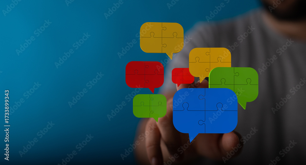 WEBLUX obraz na plátně 1D, 3D, 4D, 5D - Conceptual illustration of a network of colorful jigsaw puzzle speech bubbles. Connecting ideas through communication and teamwork.