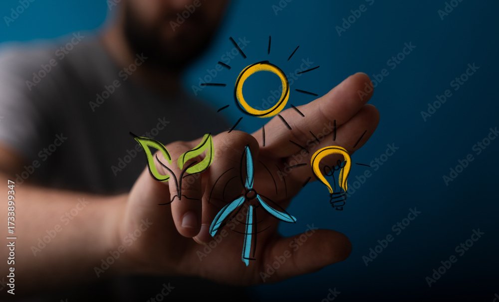 WEBLUX obraz na plátně 1D, 3D, 4D, 5D - Hand holding eco-friendly icons: sun, plant, wind turbine, lightbulb. Concept of renewable energy, sustainability, and innovation.