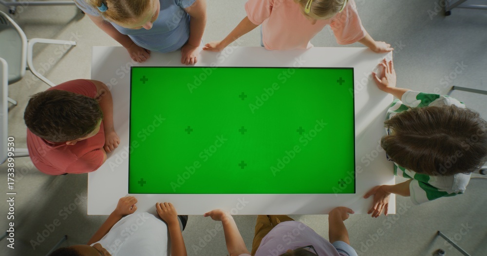 WEBLUX obraz na plátně 1D, 3D, 4D, 5D - Students Explore Digital Learning Material in Digital Screen With Chromakey Layout. Green Screen Fill For Educational Content or Interactive Visual Effects. Concept of Modern Technology. Top View.