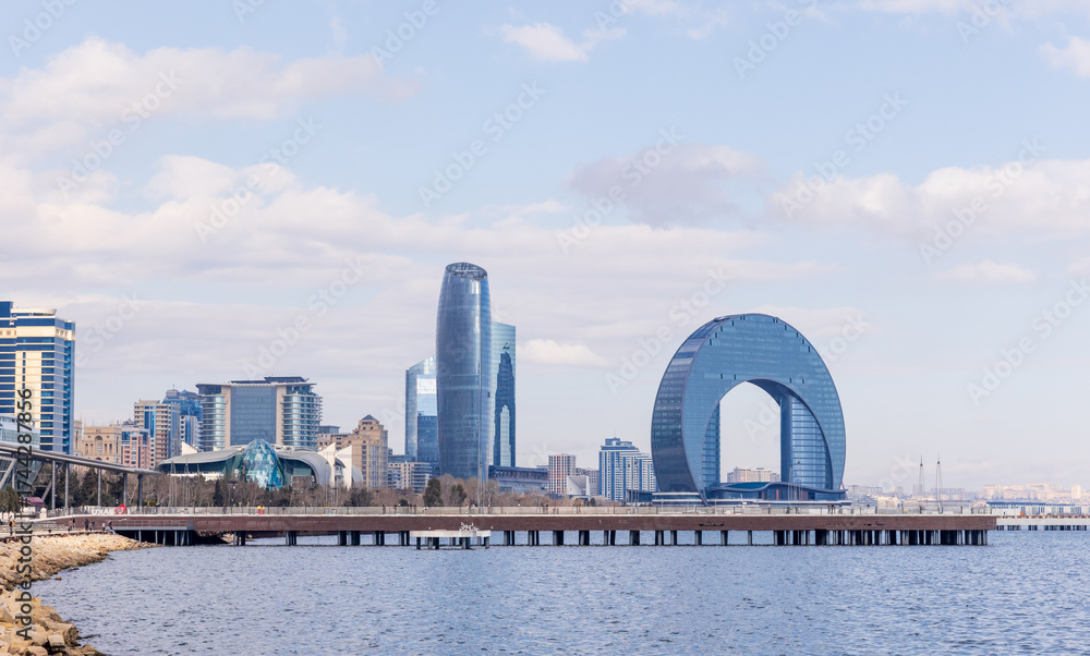WEBLUX obraz na plátně 1D, 3D, 4D, 5D - A serene waterfront cityscape featuring glass towers and a distinctive circular arch
