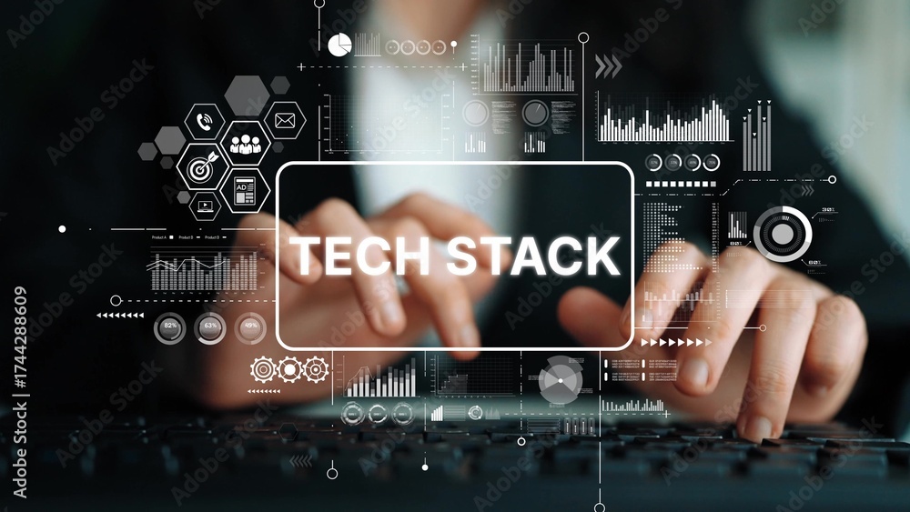 WEBLUX obraz na plátně 1D, 3D, 4D, 5D - Hands Typing on Keyboard with Tech Stack Graphics in a Modern Workspace Environment. Asymptotic smart data analytic.