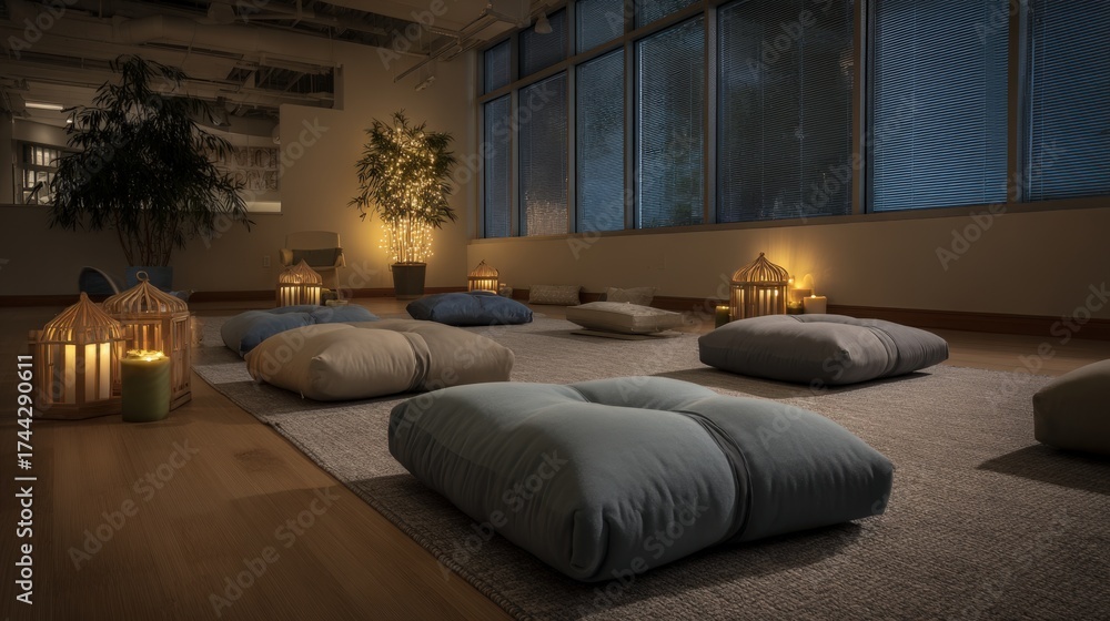 WEBLUX obraz na plátně 1D, 3D, 4D, 5D - Medium shot of a serene meditation room with soft lighting and cushions arranged for relaxation and mindfulness practice in a stress relief facility.