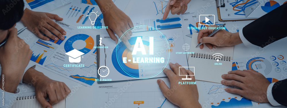 WEBLUX obraz na plátně 1D, 3D, 4D, 5D - Group of professionals engaged in a strategic meeting focusing on AI and e-learning. The image features charts, graphs, and collaboration towards future educational goals. Trope