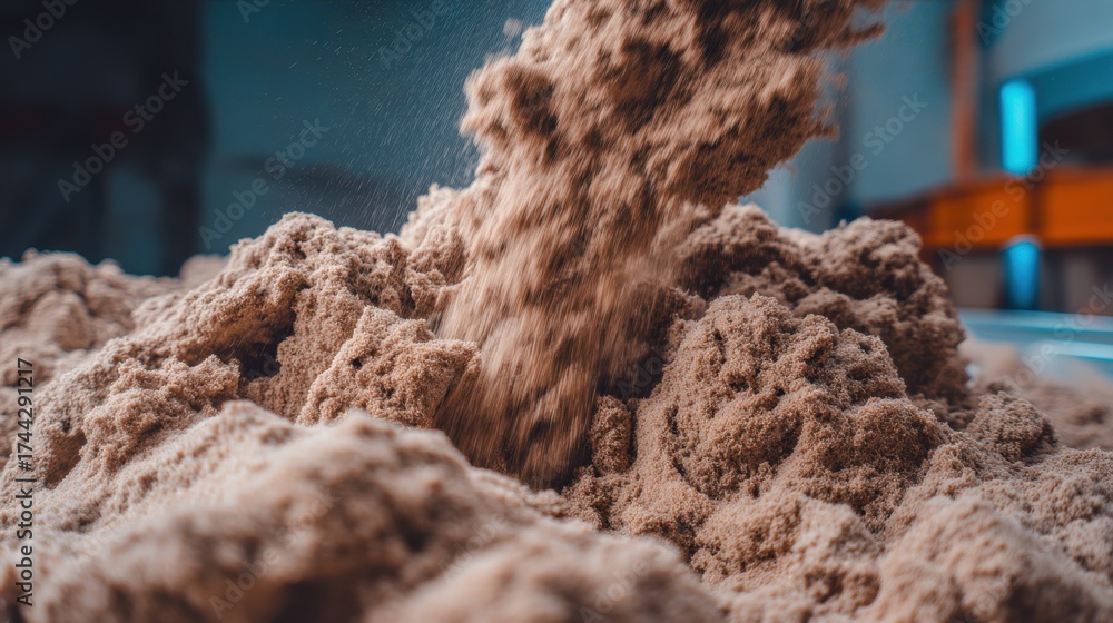 WEBLUX obraz na plátně 1D, 3D, 4D, 5D - Medium shot of mash animal feed pouring into a container showcasing texture and bulk handling with outoffocus equipment behind.