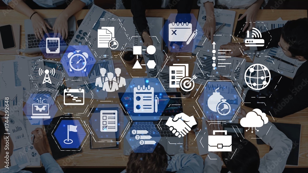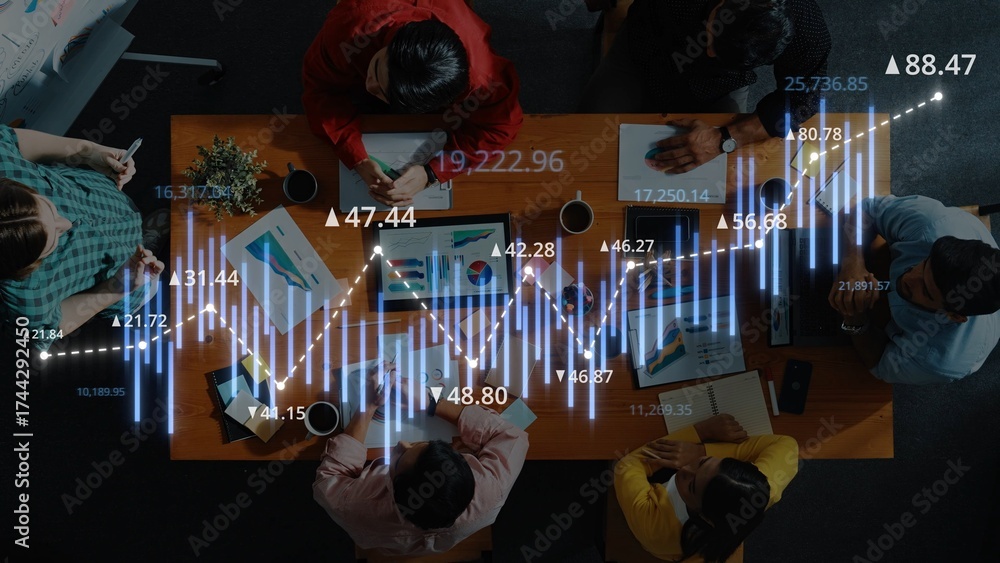 WEBLUX obraz na plátně 1D, 3D, 4D, 5D - High-angle view of business professionals gathered around a conference table, analyzing financial graphs and data in a modern office setting. Raster