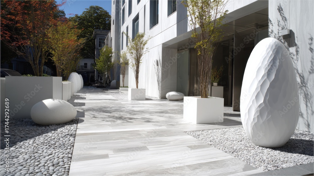 WEBLUX obraz na plátně 1D, 3D, 4D, 5D - Urban landscape with smooth stone pathways and sculptural planter boxes offering a polished and organized exterior space.