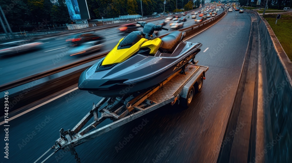 WEBLUX obraz na plátně 1D, 3D, 4D, 5D - Medium shot of a jet ski securely strapped on a trailer in transit the craft sharply detailed against a blurred highway and passing vehicles