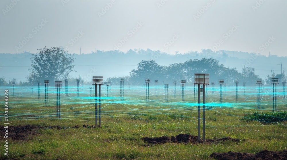 WEBLUX obraz na plátně 1D, 3D, 4D, 5D - Medium shot showing a network of IoT pest traps strategically placed throughout a farm field transmitting data to a central hub for crop protection