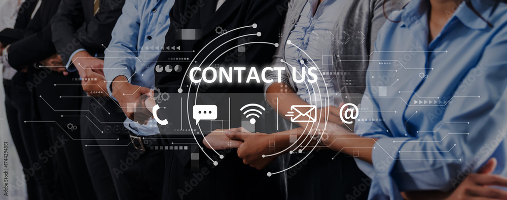 WEBLUX obraz na plátně 1D, 3D, 4D, 5D - A group of business professionals showcasing collaboration with digital communication icons, focusing on customer outreach and engagement strategies in a modern workspace. Trope