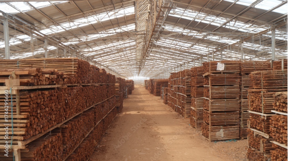 WEBLUX obraz na plátně 1D, 3D, 4D, 5D - Focused view of plantationgrown timber beams on drying racks showcasing controlled tree farming and sustainable resource use.
